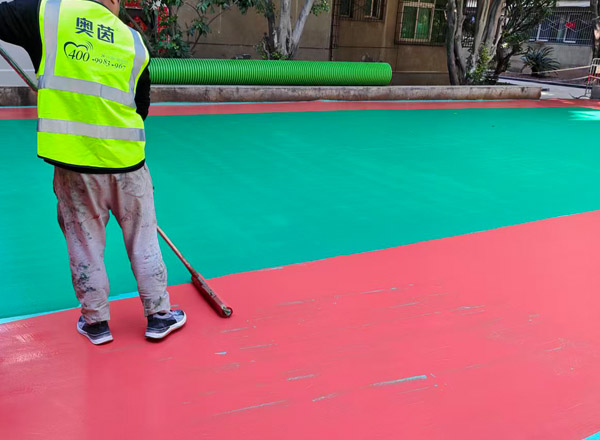 5、奧茵硅pu彈層工藝:彈性層材料為液體粘稠狀,彈性層、3%-6%稀釋劑、氣溫低于5℃時,加入50g-100g水(根據(jù)氣溫、空氣濕度)攪拌均勻,同一方向均勻把混合料呈長條狀倒在基面上,材料倒完后把桶倒置讓余料流凈。奧茵硅pu彈性層涂刷厚度控制在2mm以內(nèi),刮涂彈層期間不可有漏刮或積料現(xiàn)象。確保刮涂后的奧茵硅pu彈層材料流平性。待第一遍彈性層材料固化后,再使用同類方法以此類類推直到做到固定厚度,這里有個誤區(qū)完成后的奧茵硅pu彈層面層厚度會有一定的誤差,主要原因為硅pu彈層層材料為液體,涂刷之后會有一定的流動性,低處會積料多一些,高處相關會少一些,這就是造成固化后厚度不一致的原因。