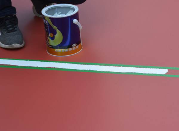 9、硅pu球場劃線工藝:測量球場主副場尺寸,做到奧茵硅pu球場顏色分區(qū)面層固化后,用鑒定過的鋼尺,經(jīng)緯儀放設點位線,內(nèi)控相對誤差為±0—±1/10000,用美紋紙沿線位兩邊粘貼,中間預留寬度尺寸應符合球場的界線寬度要求。劃線主漆與固化劑攪拌后,請于1小時內(nèi)施工完成。留存的材料不可重復使用,按色別要求將劃線漆涂刷在美紋紙之間,待其涂漆表面干固將美紋紙撕掉即可。